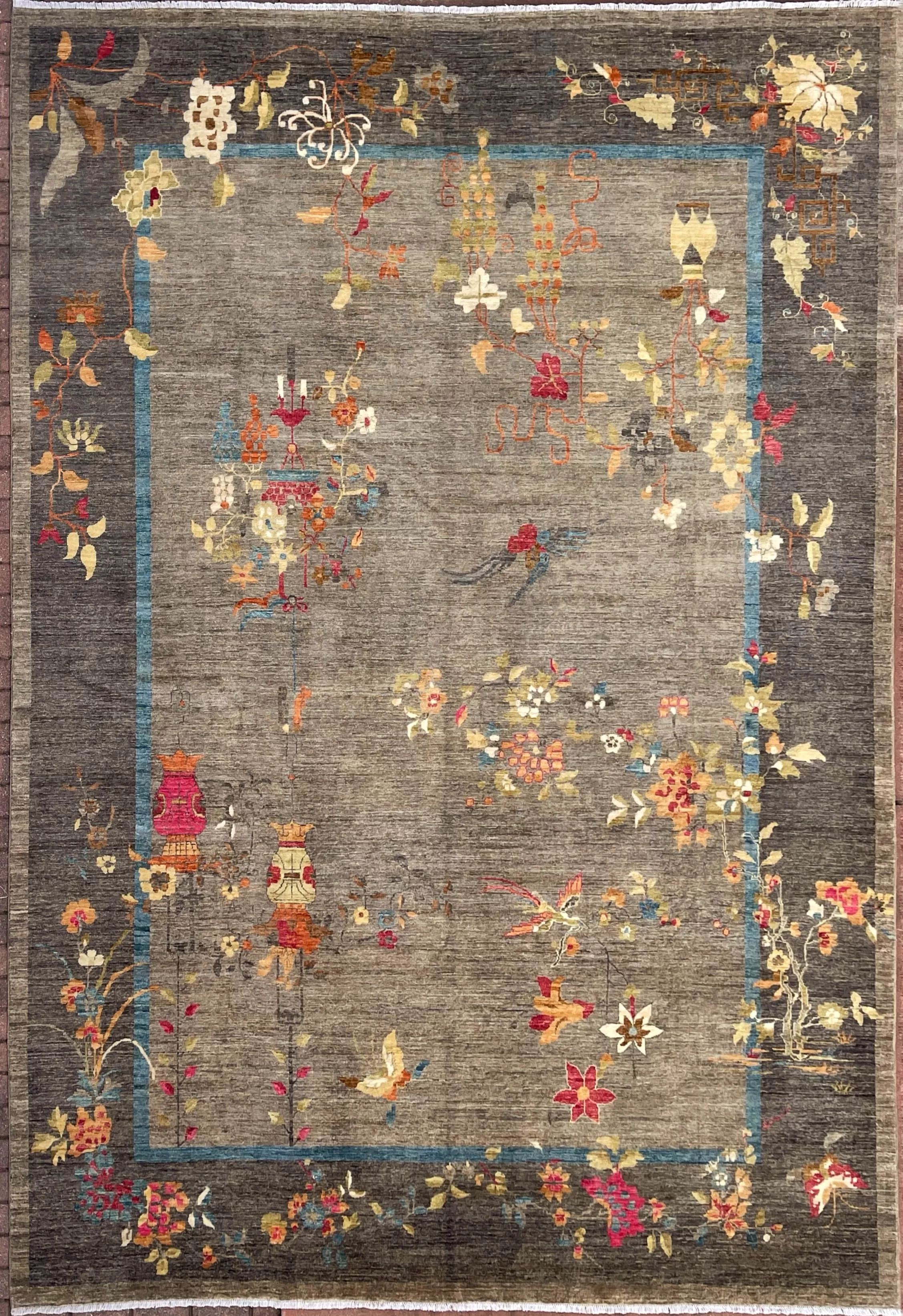 Questo elegante tappeto di grandi dimensioni riproduce con cura il classico disegno Pekino antico, uno stile iconico della tradizione cinese noto per la sua armonia visiva, i motivi simbolici e la palette raffinata. Il fondo in grigio cenere crea un’atmosfera morbida e contemporanea, mentre i dettagli policromi – fiori, uccelli ornamentali e piccoli elementi decorativi .