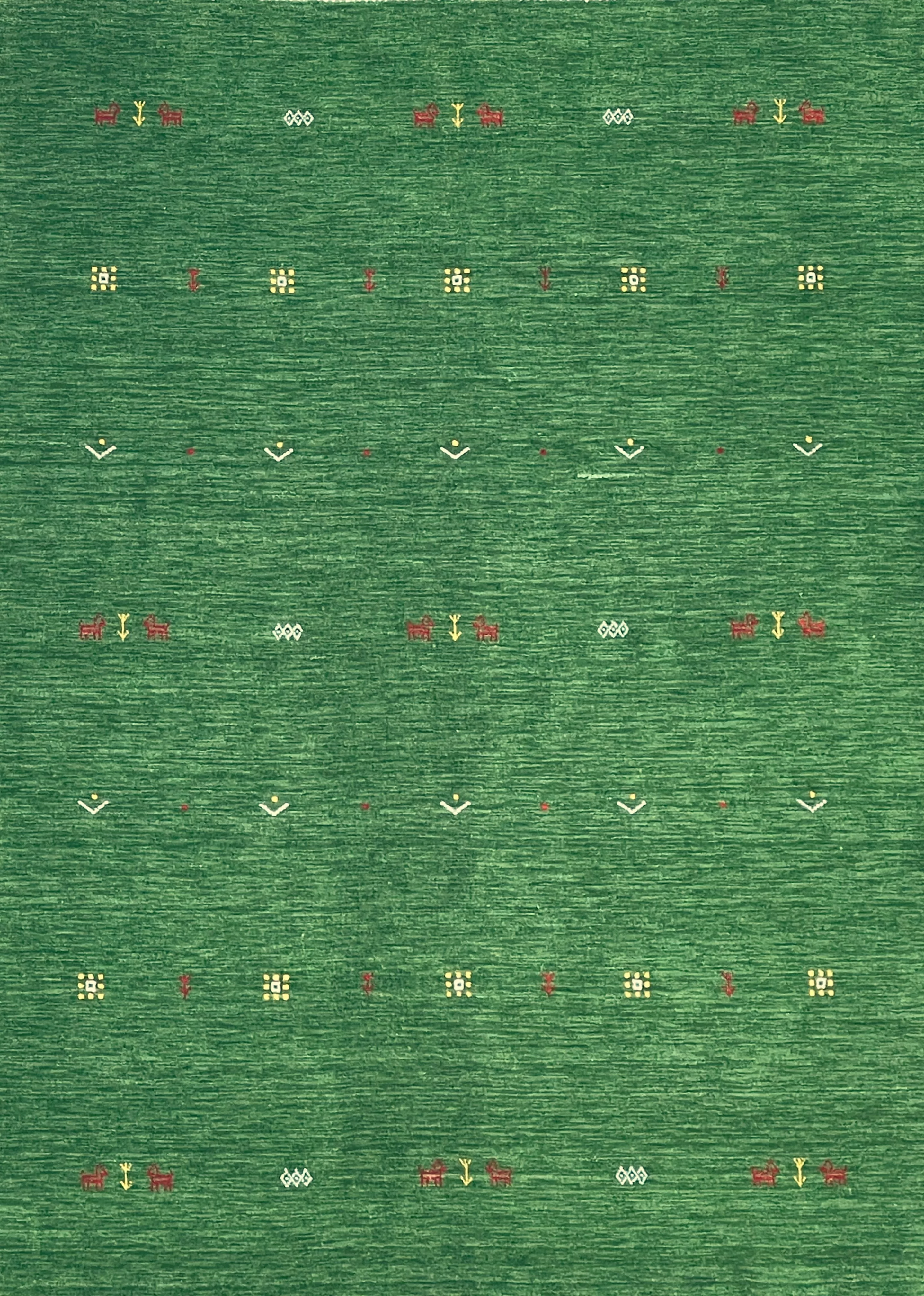 Tappeto Indo kashquli artigianale ispirato ai celebri Gabbeh persiani, noto per il suo stile rustico, colori vivaci e motivi simbolici. Realizzato con cura su telaio manuale, questo tappeto presenta una base verde intensa arricchita da motivi animali stilizzati (cavalli, cervi) e simboli geometrici e vegetali disposti in righe simmetriche.