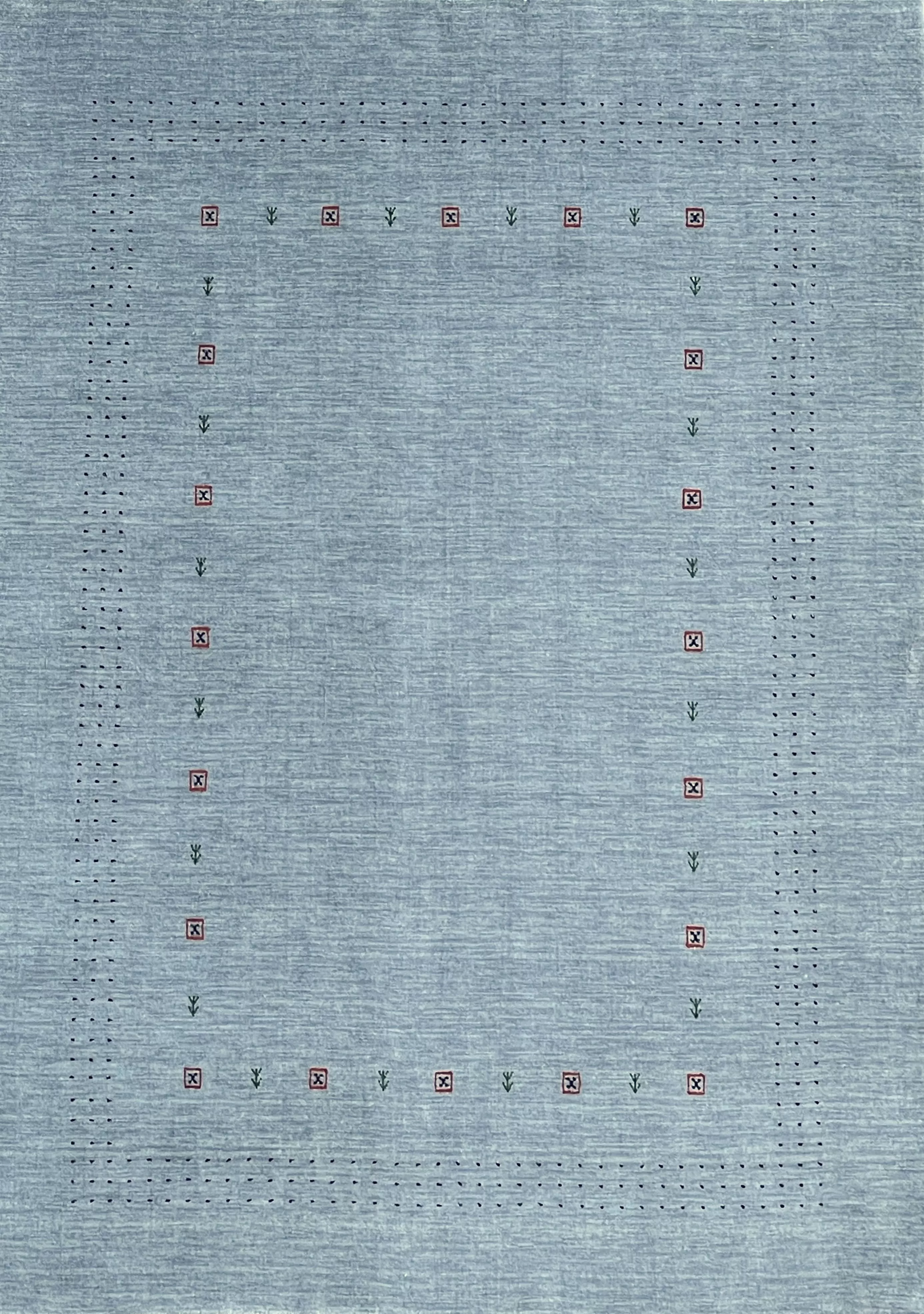 Tappeto Indo kashquli artigianale ispirato ai celebri Gabbeh persiani, noto per il suo stile rustico, colori vivaci e motivi simbolici. Realizzato con cura su telaio manuale, questo tappeto presenta una base grigio chiaro arricchita da motivi animali stilizzati (cavalli, cervi) e simboli geometrici e vegetali disposti in righe simmetriche.