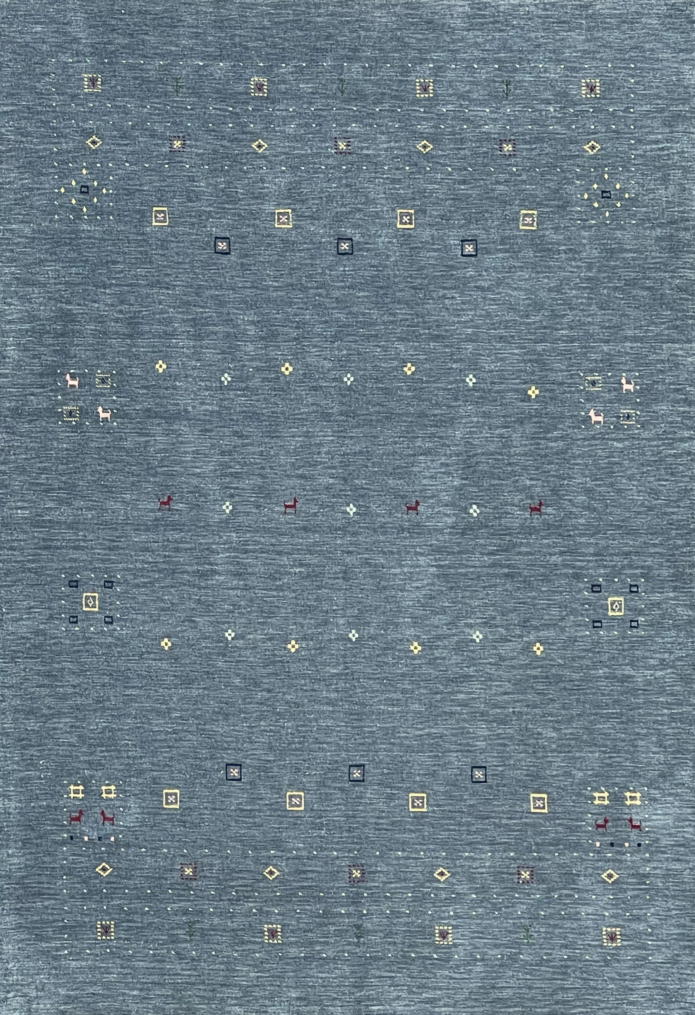 Tappeto Indo kashquli artigianale ispirato ai celebri Gabbeh persiani, noto per il suo stile rustico, colori vivaci e motivi simbolici. Realizzato con cura su telaio manuale, questo tappeto presenta una base grigio arricchita da motivi animali stilizzati (cavalli, cervi) e simboli geometrici e vegetali disposti in righe simmetriche.