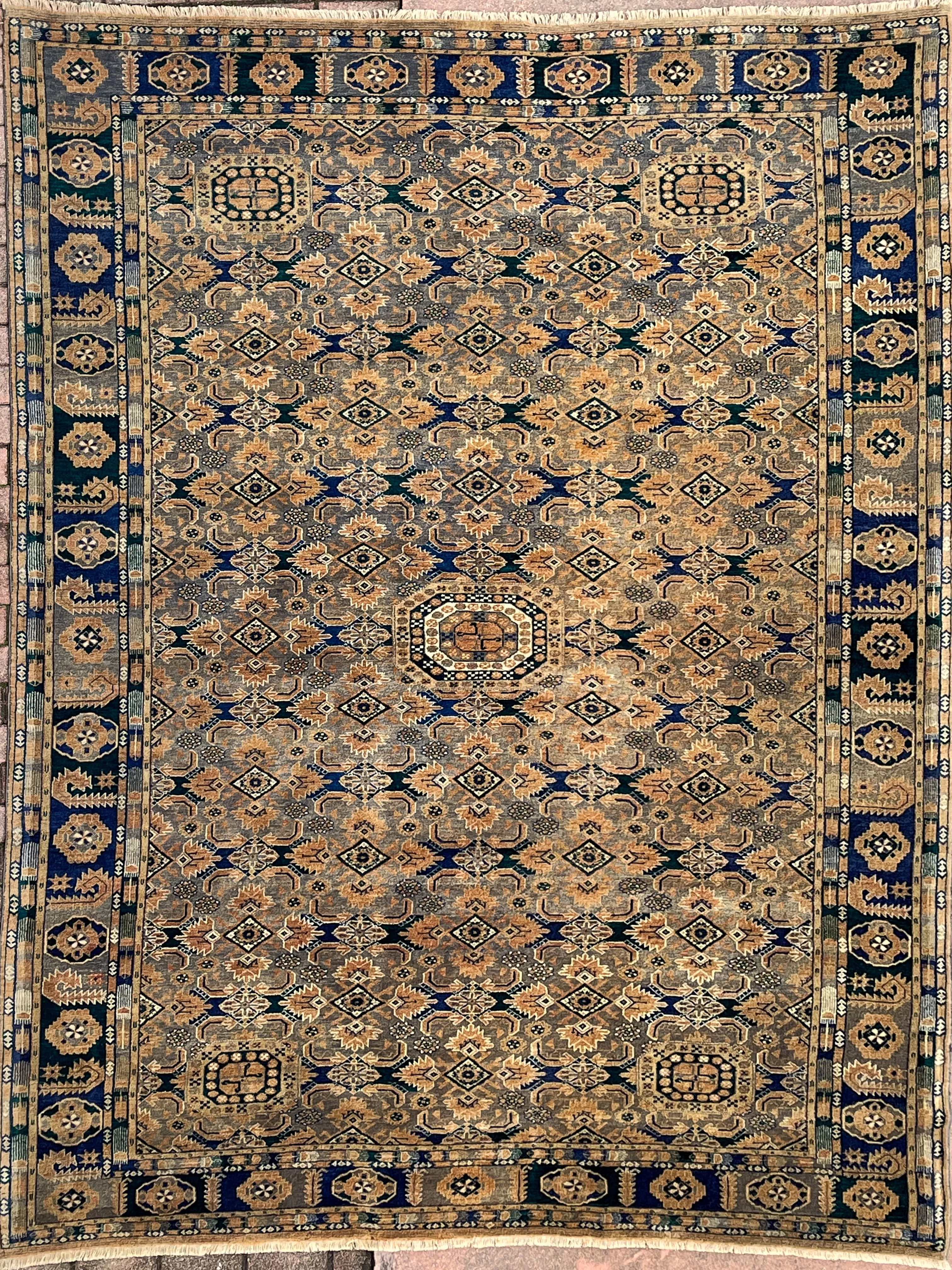 Scopri l’eleganza senza tempo del tappeto Bukara russo, un capolavoro artigianale che fonde tradizione e raffinatezza. Questo esemplare unico si distingue per la sua palette cromatica inusuale: grigio perla, blu profondo e verde , tonalità rare che donano al tappeto un fascino sofisticato e contemporaneo.