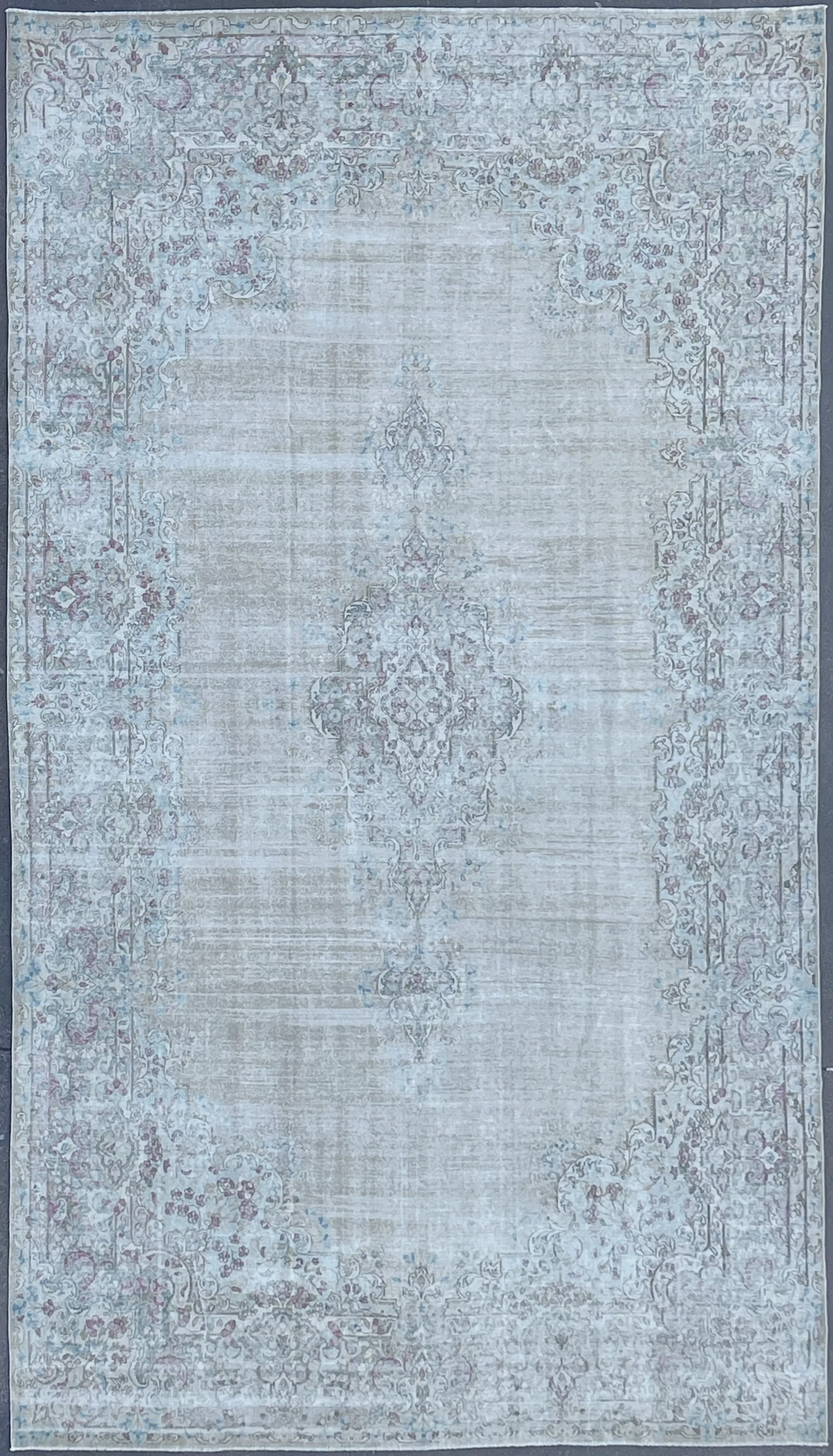 Un magnifico tappeto vintage Kirman di misura extra 520 x 302 cm, caratterizzato da un’eleganza senza tempo e da una palette pastello su base gialla che illumina l’ambiente con delicatezza. Il suo medaglione centrale classico, armoniosamente incorniciato da un bordo ricamato con motivi floreali rosa e azzurri, richiama la tradizione persiana Kirman reinterpretata in chiave morbida e vissuta.